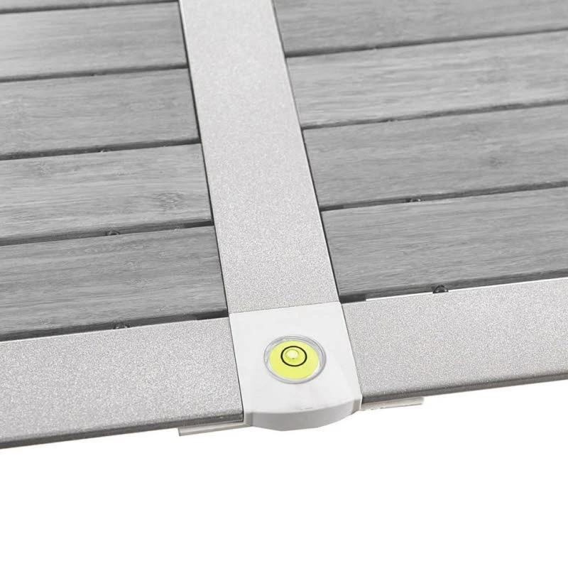 Alu-Falttisch mit rollbarer Tischplatte. Dank integrierter Wasserwaage kann auch auf unebenem Untergrund eine absolut horizontale Positionierung der Tischplatte erreicht werden (Level System). Stabiles Untergestell mit verstellbarem Standbein. Ein Packsack für den komfortablen Transport ist im Lieferumfang enthalten.