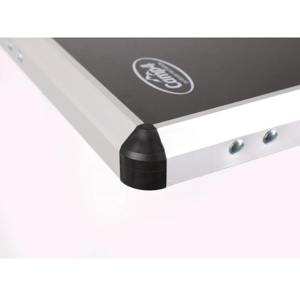 Der Camp4 Campingtisch Tore ist ein Leichtgewicht. Er wiegt nur 4 kg, bietet Platz für 2-4 Personen und ist sogar bis max. 50 kg belastbar. Das Gestell ist aus Aluminium und die Tischplatte ist eine schwarze MDF-Tischplatte mit Aluminium-Einfassung. Die Füße sind bis zu 2 cm ausschraubbar, um Unebenheiten des Bodens auszugleichen. Zum bequemen Tragen hat die Tischplatte einen Tragegriff.