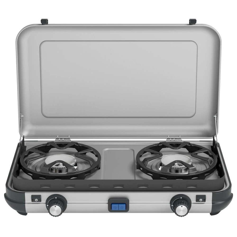Der mit Gaszylinder betriebene Camping Kitchen 2 Maxi verfügt über zwei unabhängige Brenner, mit denen man Wärme individuell regulieren kann.