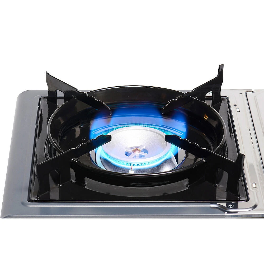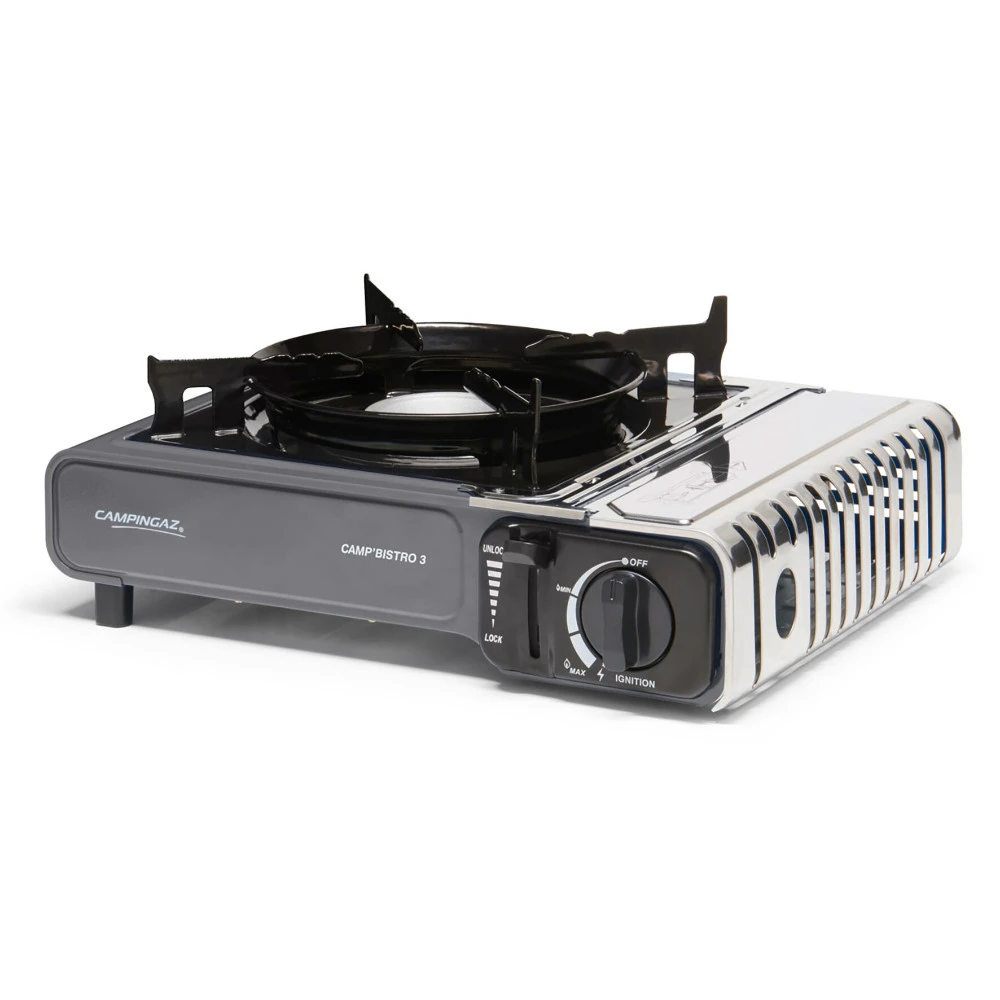 Kompakter, leichter Campingkocher mit einer Leistung von 2200 Watt, Piezozündung, Dual Safety System, Topfträger aus emailliertem Stahl und inkl. Transportkoffer.