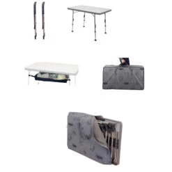 Leichter Camping-Klapptisch mit widerstandsfähiger Melamin-Tischplatte. Dank vier verstärkten regulierbaren Tischbeinen von 28 mm Durchmesser und seitlichen Verstrebungen ist auf jedem Untergrund ein fester Stand gegeben. Das Fixiersystem verfügt über hochwiderstandsfähige Gleitschienen. Die Epoxybeschichtung der Aluminiumstruktur sorgt für eine noch höhere Robustheit und ist pflegeleicht. Seitliche Verstrebungen für einen sicheren Stand. Tischplatte aus widerstandsfähigem Melamin.