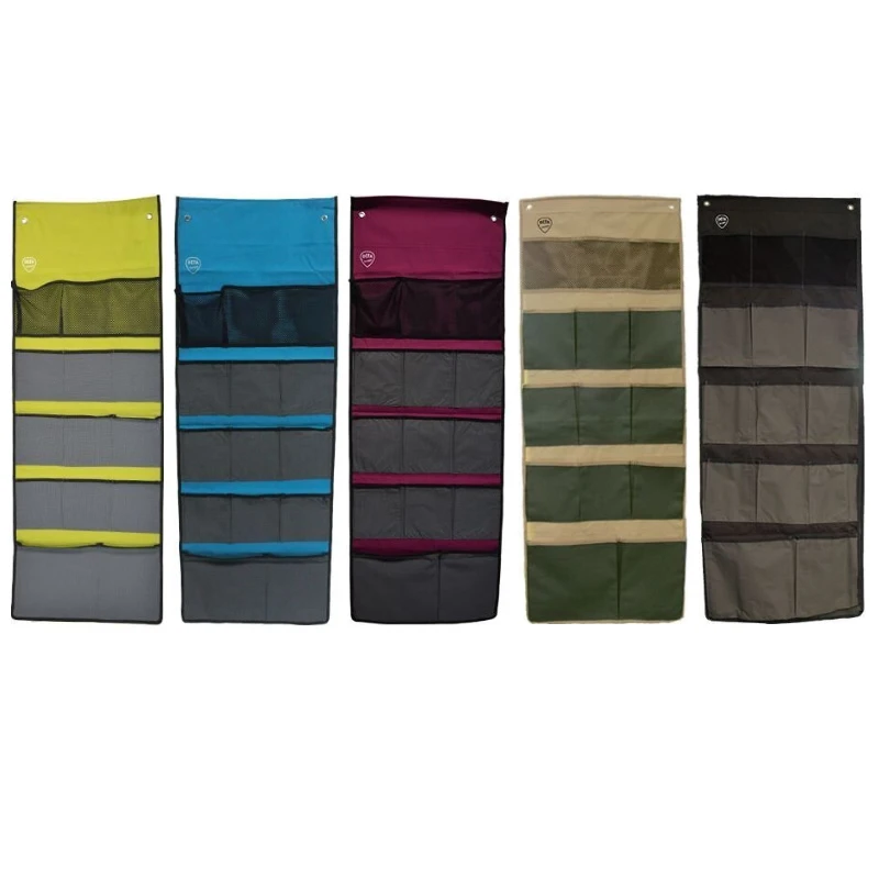 Organizer mit 14 geräumige Taschen, einer Zeltschienen-Schnur zum einfachen Aufhängen, 2 Aufhängeösen und einem Klettband zur Rahmenbefestigung.