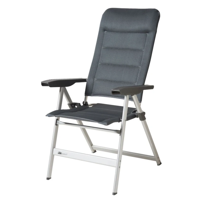 Gepolsterter Stuhl mit einem ultra starken, witterungsbeständigen 3D Mesh Gewebe. Die Rückenlehne ist ergonomisch geformt und 10-fach verstellbar. Gestell aus Aluminium, innen verstärktes anodisiertes Oval–Rohr. Armlehnen extra breit und aus glasfaserverstärktem Nylon.