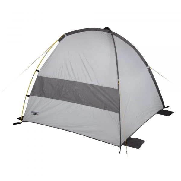 Das freistehende Strandzelt lässt sich besonders leicht und schnell aufbauen. Schieben Sie die zwei gleichlangen Gestänge einfach durch die einseitig geschlossenen Tunnel und schon können Sie das Strandzelt aufrichten. Dank seiner einzigartigen Form bietet es viel Platz und spendet Schatten. Das aluminiumbeschichtete Außenmaterial hat einen Sonnenschutzfaktor von UV 80 (nach Standard 801).