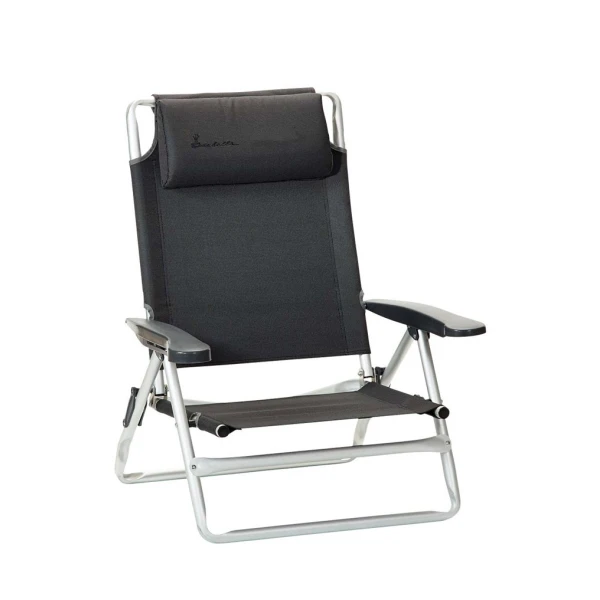 Zusammenklappbarer Strandstuhl mit Kopfpolster. Die Rückenlehne kann in 8 verschiedene Positionen verstellt werden.
