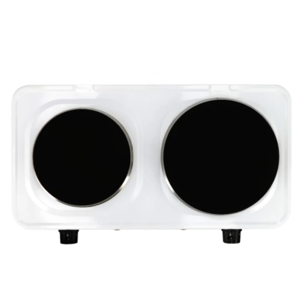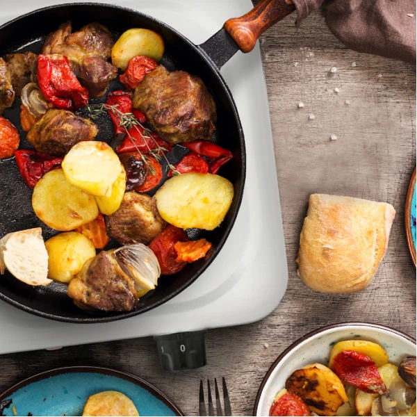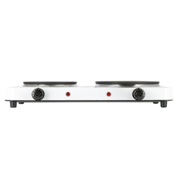 Elektrische Kochplatte mit einstellbarem Thermostat, hitzebeständigem Gehäuse, Überhitzungsschutz, roter Kontrollleuchte und Antirutsch-Füßen.