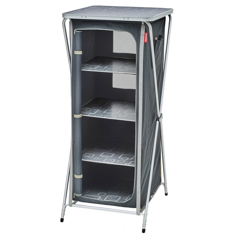 Bezug aus strapazierfähigem 500D Polyester (100 % Polyester), Rahmen aus Aluminium Durchm. 19 mm. Vier gemusterte Fachböden, abnehmbare Arbeitsplatte, Belüftung auf der Rückseite. Inklusive Tragetasche.